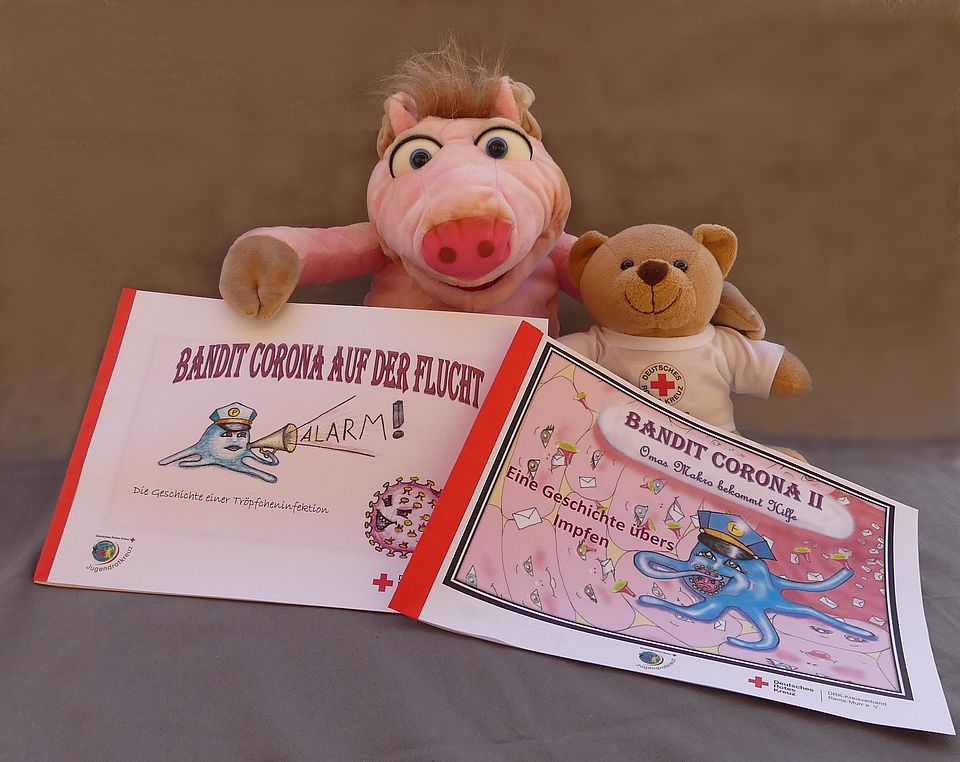 Das Kinderbuch „Bandit Corona II – Omas Makro bekommt Hilfe“ kann kostenlos auf der Homepage des DRK Rems-Murr heruntergeladen werden. Diese „Geschichte übers Impfen“ gibt es auch als Ausmalversion für die Kleinen.