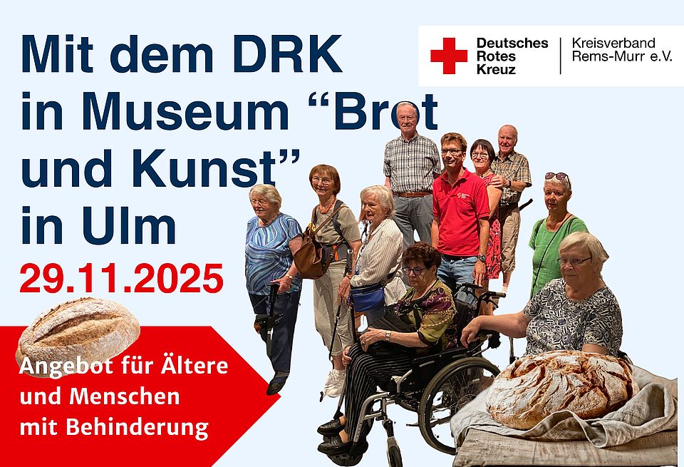 Das DRK will Älteren und Menschen mit Handicap Erlebnisse ermöglichen, die sie sonst nicht erfahren könnten. Einen begleiteten Ausflug mit Führung für diese Menschen bietet der DRK-Kreisverband Rems-Murr e.V. am Samstag, 29. November, an. Gemeinsam geht es ins Museum „Brot und Kunst“ nach Ulm. Die Ausstellung im Museum Brot und Kunst hat zwei Teile. Auf der einen Seite steht die Kunst, auf der anderen die Themen rund um Brot, Alltag, Ernährung und Konsum. Wer Interesse hat, wird vom DRK Rems-Murr am Samstag, 29. November, vormittags zu Hause abgeholt und wieder zurückgebracht. Während des gesamten Ausflugs stehen erfahrene Mitarbeiter bereit, um die Teilnehmerinnen und Teilnehmer zu begleiten. Auch Angehörige sind herzlich eingeladen, sich zum Ausflug anzumelden. Nach dem Museumsbesuch – eine Führung ist eingeplant – ist eine gemeinsame Einkehr auf eigene Rechnung in einem Restaurant vorgesehen. Für Hin- und Rückfahrt, Eintritt und Führung berechnet das DRK einen Pauschalpreis von 95,90 Euro pro Person – auch für Begleitpersonen. Die Teilnehmerzahl ist auf 20 Personen begrenzt. Anmeldungen bis Mittwoch, 19. November, bei Frau Dorothea Franz unter 07151 2002-31 (Montag bis Donnerstag, 8 bis 11.30 Uhr) oder per Mail, dorothea.franz@drk-rems-murr.de, anmelden.