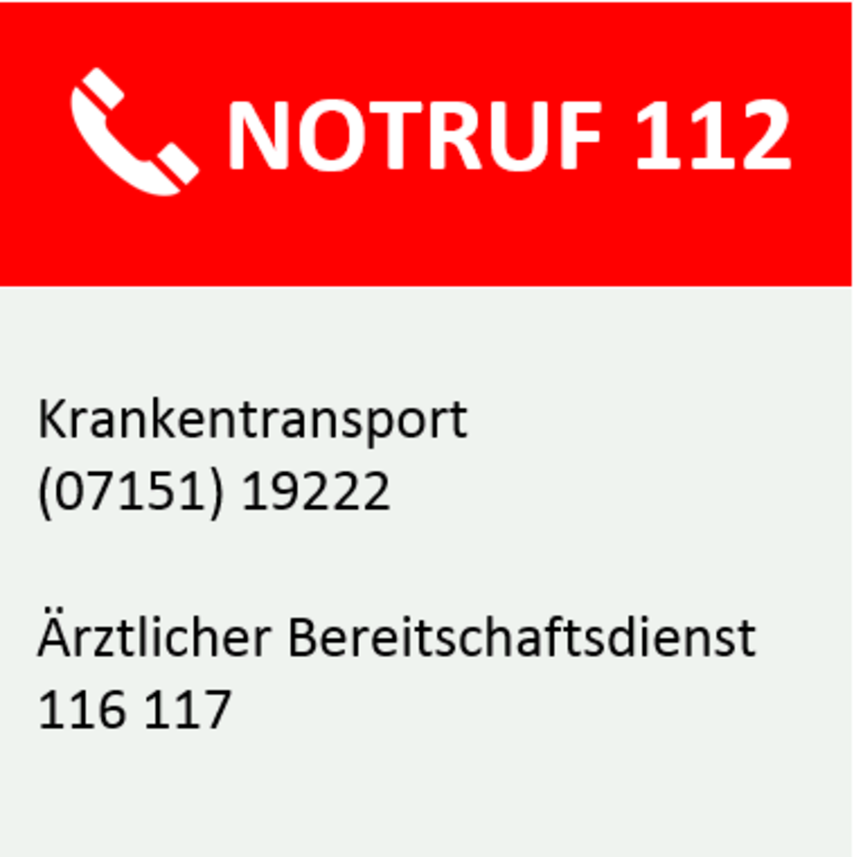Die (07151) 19222 ist die Rufnummer für die Anmeldung von Krankentransporten. Krankentransporte können für nicht akute Transporte von verletzten oder erkrankten Personen verordnet werden, die während der Fahrt einer fachlichen Betreuung bedürfen.